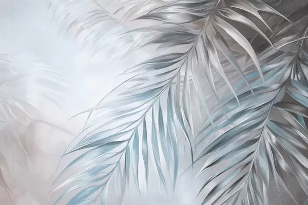 Murais de parede Folhas de palmeira com tons de laranja e azul, fundo com textura clara e cores suaves, estilo tropical elegante Nr. w09475