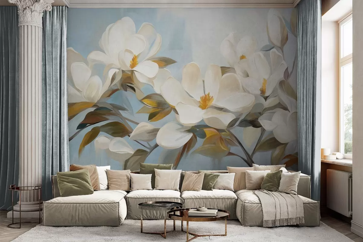 Murais de parede Magnólias brancas com folhas verdes sobre fundo azul claro com pinceladas abstratas imitação Nr. w09478