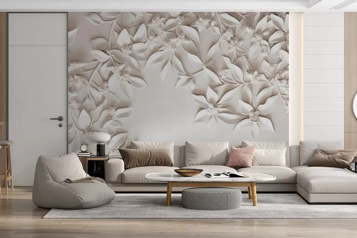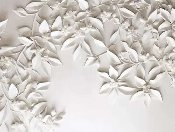 Murais de parede Flores e folhas brancas texturizadas, arranjo floral, design elegante, estilo minimalista, arte decorativa Nr. w09479