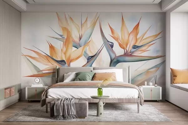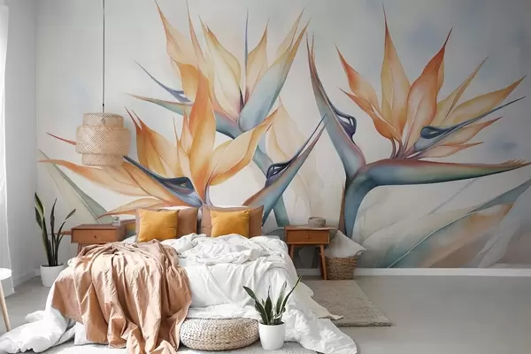 Murais de parede Flor do pássaro do paraíso, strelitzia com pétalas laranja, estilo texturizado em aquarela suave, fundo claro Nr. w09483