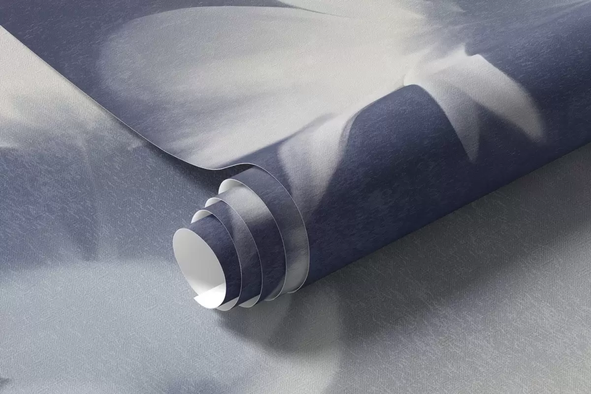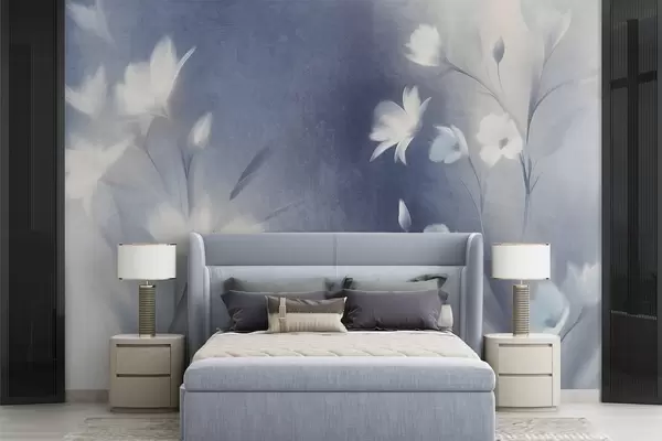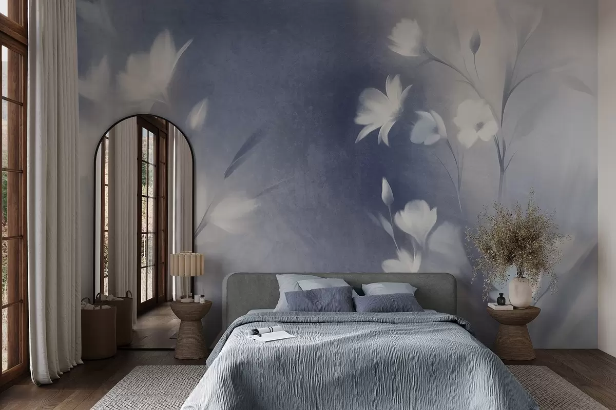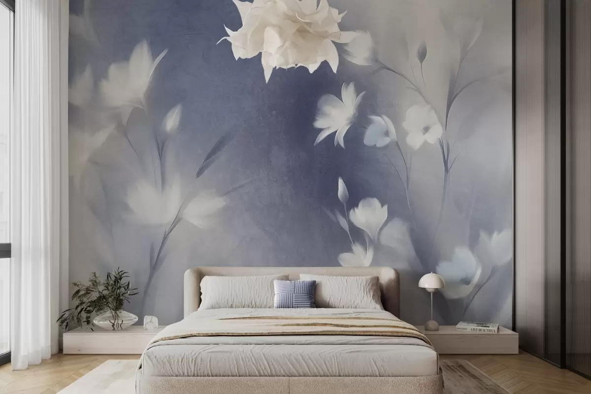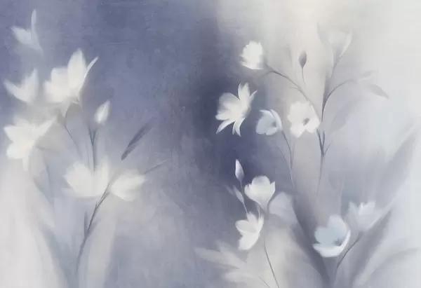 Murais de parede Flores brancas texturizadas com hastes longas, botões suaves contra um fundo desfocado de tons azuis e brancos Nr. w09484