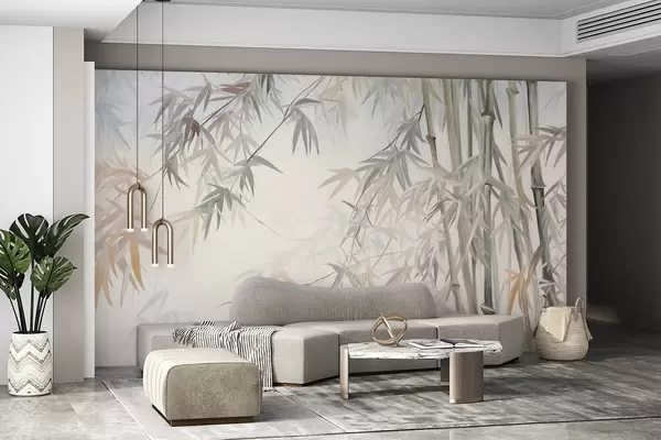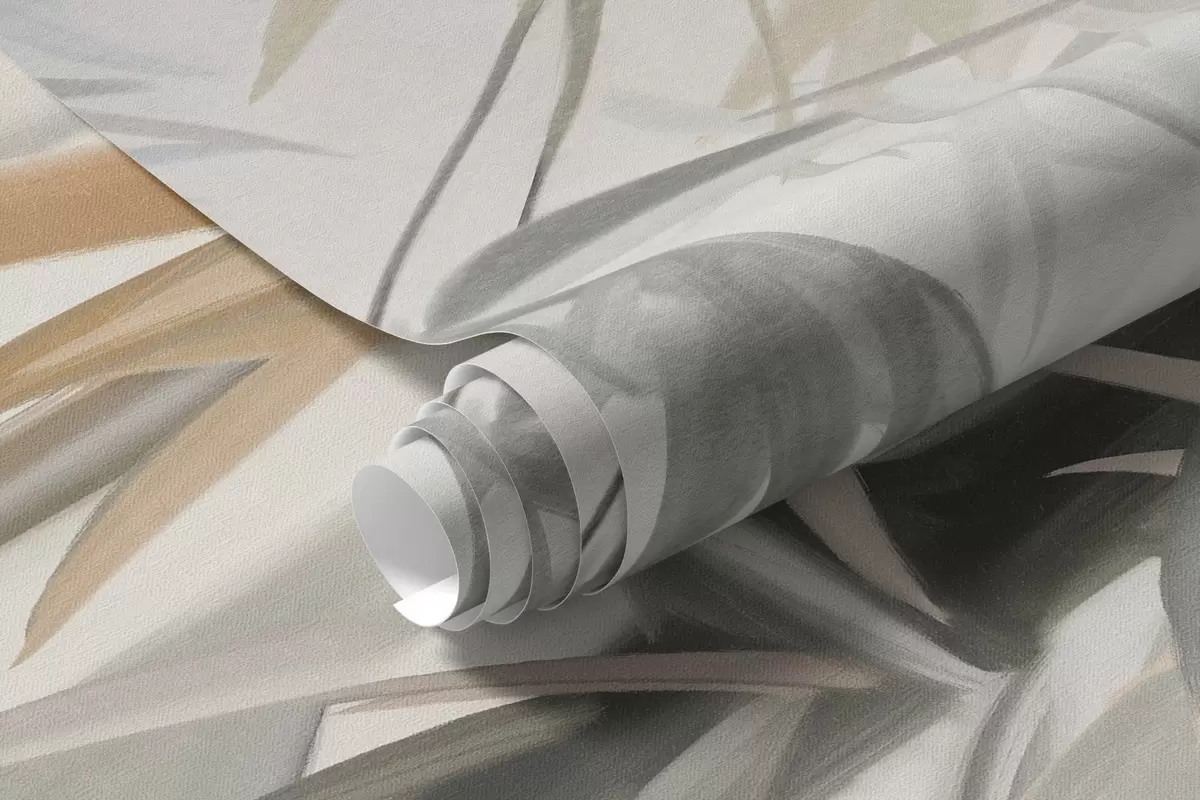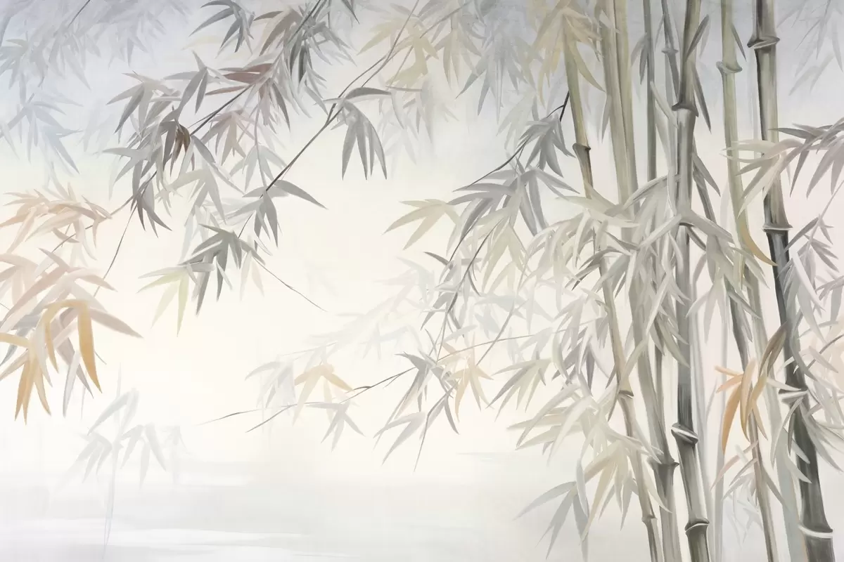 Murais de parede Caules e folhas de bambu texturizados numa paleta de cores suaves e discretas de cinza, branco e creme, composição minimalista Nr. w09485