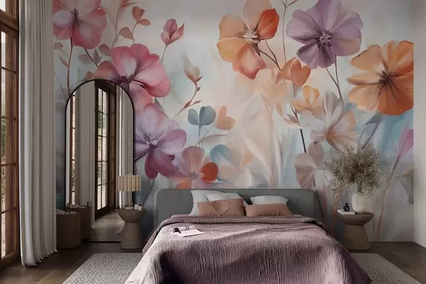 Murais de parede Arranjo floral texturizado com flores rosa, roxas e laranjas com caules e folhas verdes, em tons pastel suaves Nr. w09486
