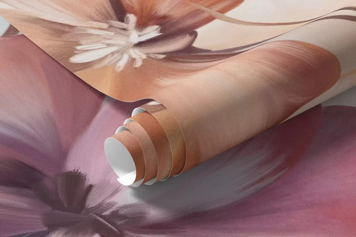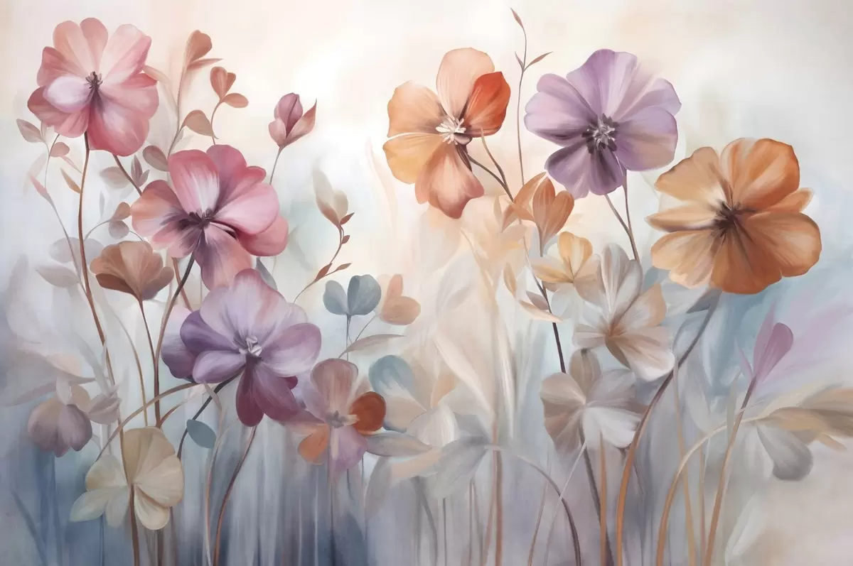 Murais de parede Arranjo floral texturizado com flores rosa, roxas e laranjas com caules e folhas verdes, em tons pastel suaves Nr. w09486