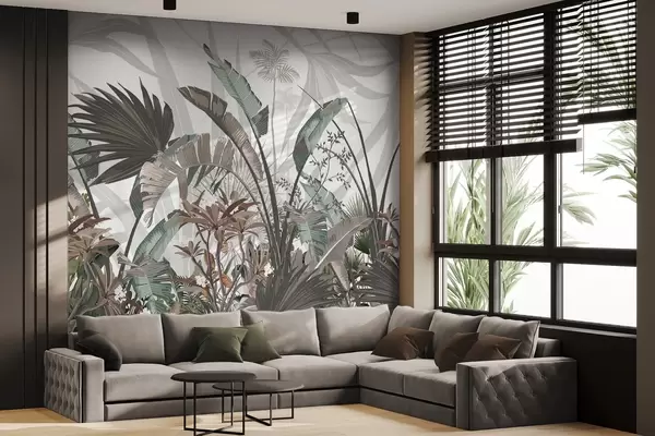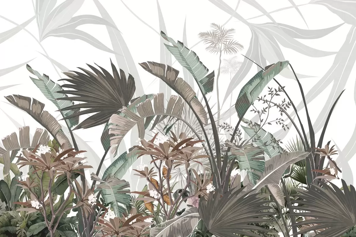 Murais de parede Folhas tropicais texturizadas com flores, palmeiras, flores de plumeria, cores pastel, fundo branco, selva Nr. w09488