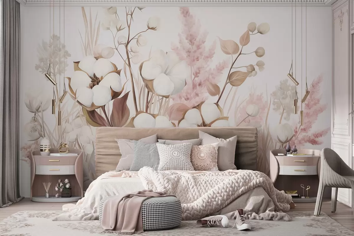 Murais de parede Flores com textura de algodão com capim-dos-pampas branco e rosa, folhas e ervas bege e castanhas, fundo branco Nr. w09489