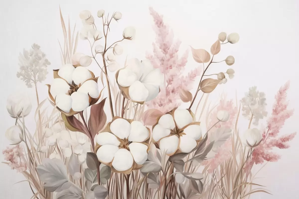 Murais de parede Flores com textura de algodão com capim-dos-pampas branco e rosa, folhas e ervas bege e castanhas, fundo branco Nr. w09489