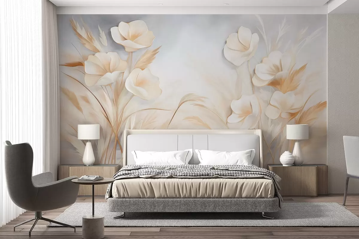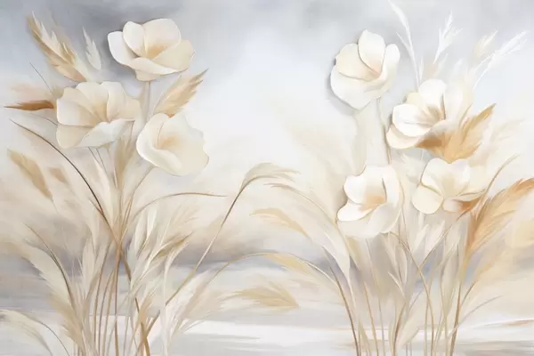 Murais de parede Flores brancas, juncos bege e capim-dos-pampas, texturizado, elegante, estilo minimalista, fundo abstrato paisagístico Nr. w09490