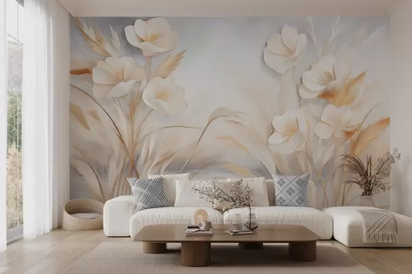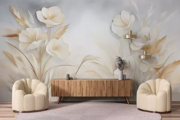 Murais de parede Flores brancas, juncos bege e capim-dos-pampas, texturizado, elegante, estilo minimalista, fundo abstrato paisagístico Nr. w09490