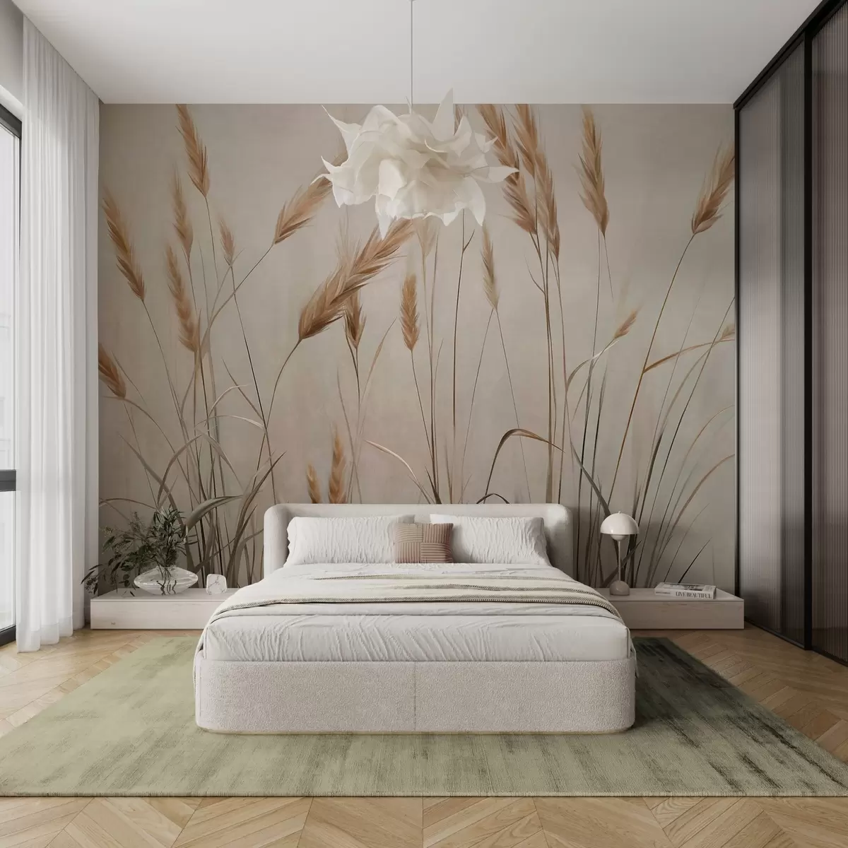 Murais de parede Campo com textura de trigo com espigas amarelas, fundo bege, iluminação natural, tons quentes, pinceladas detalhadas Nr. w09493
