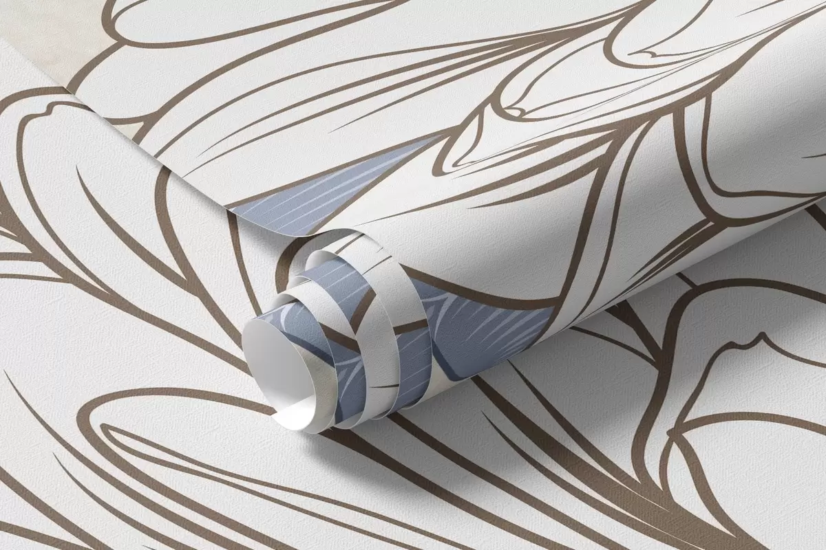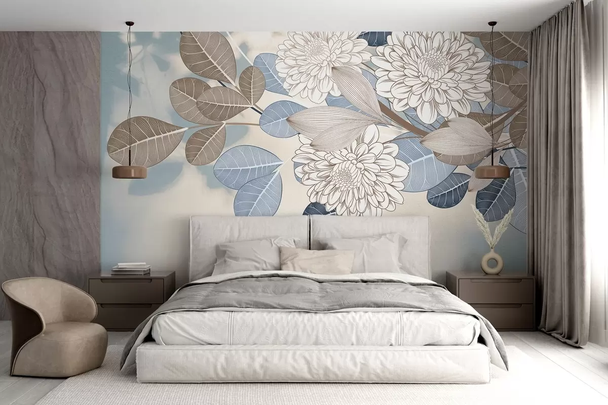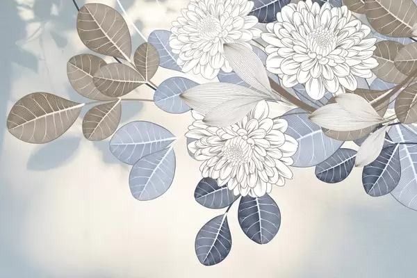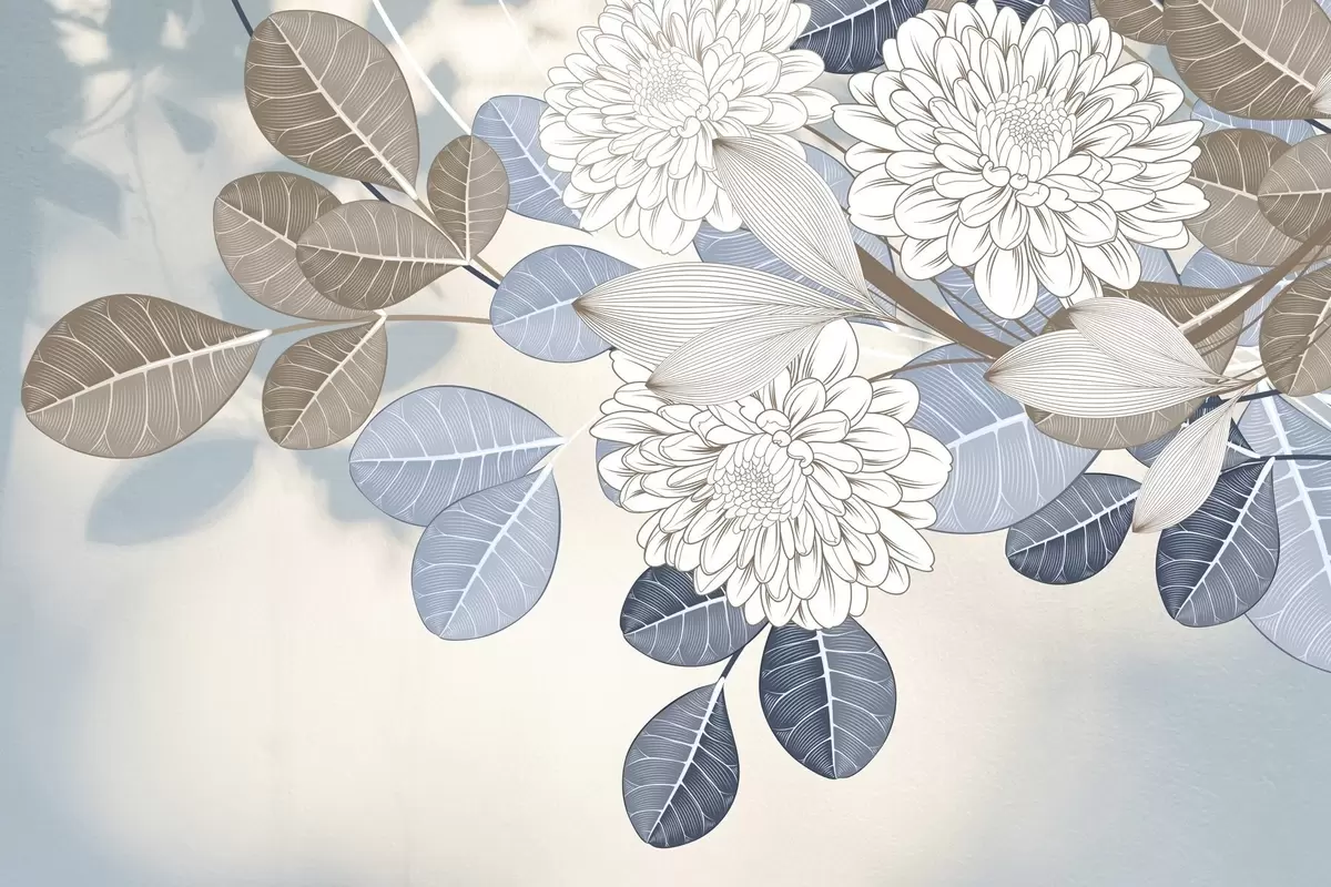 Murais de parede Flores brancas com folhas azuis e castanhas, fundo texturado azul claro, arranjo floral, arte linear detalhada Nr. w09496