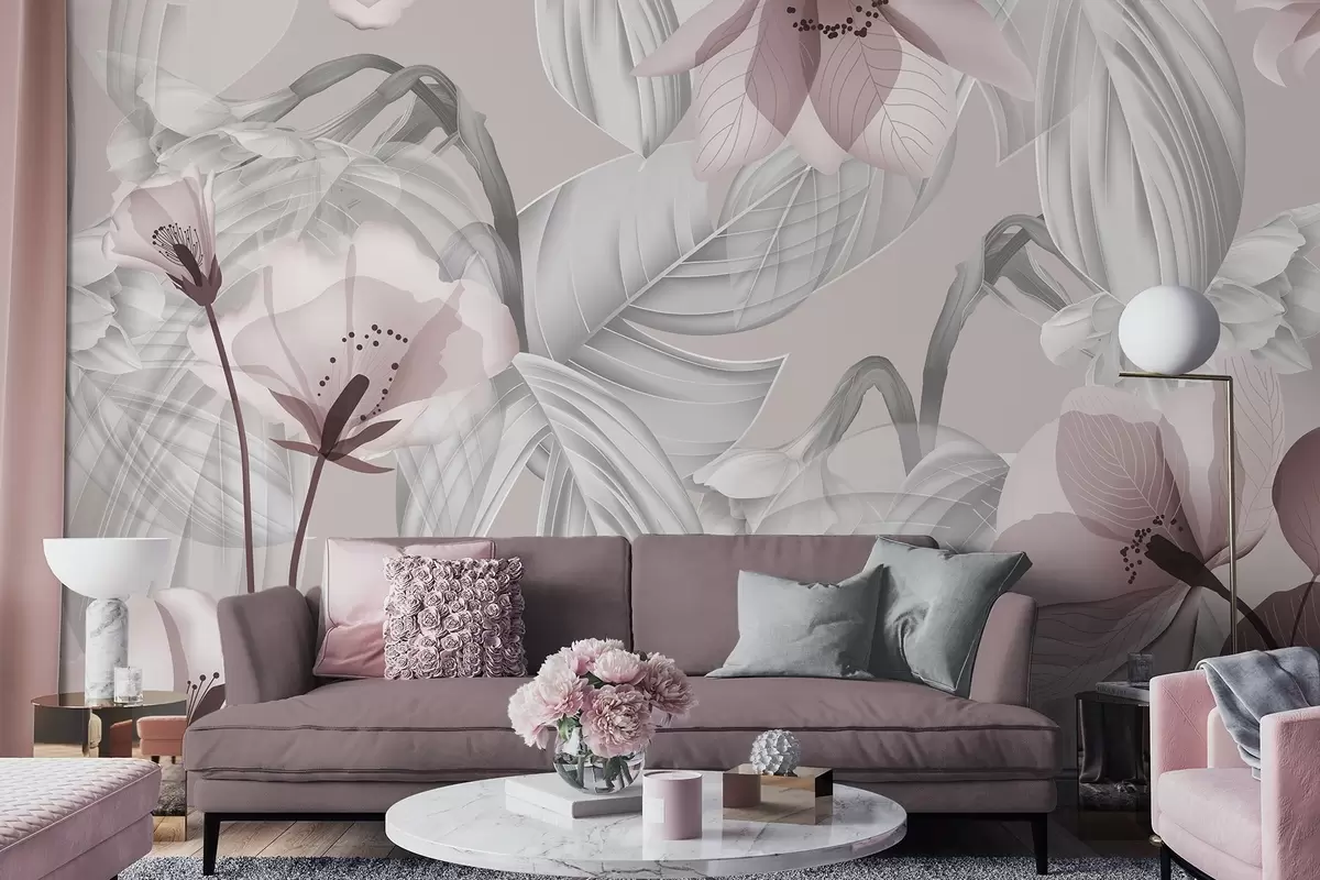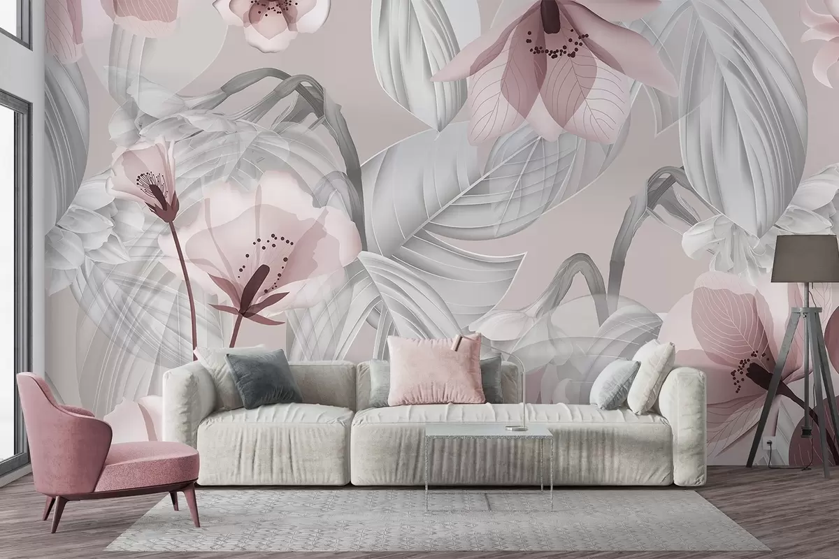 Murais de parede Flores cor-de-rosa e folhas cinzentas, fundo botânico floral, design elegante, cores suaves, detalhes delicados e leves Nr. w09497