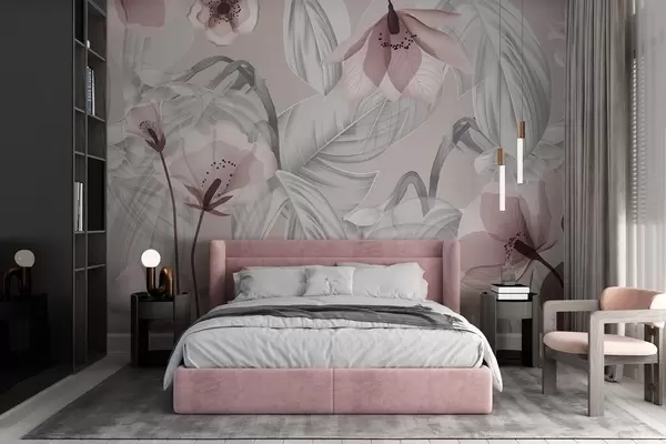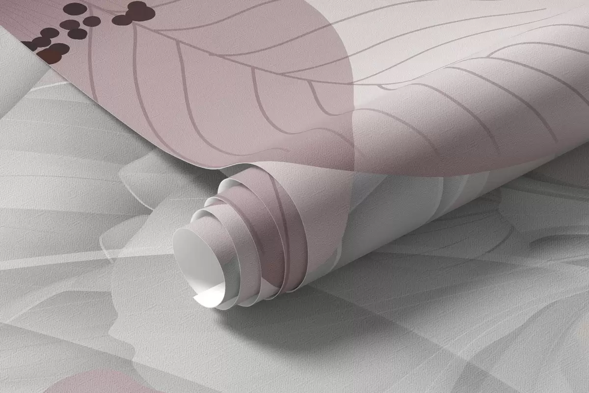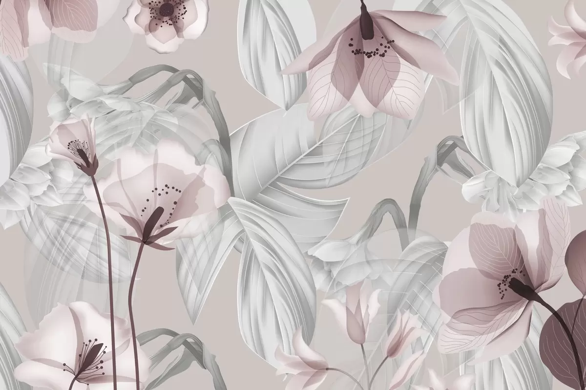 Murais de parede Flores cor-de-rosa e folhas cinzentas, fundo botânico floral, design elegante, cores suaves, detalhes delicados e leves Nr. w09497
