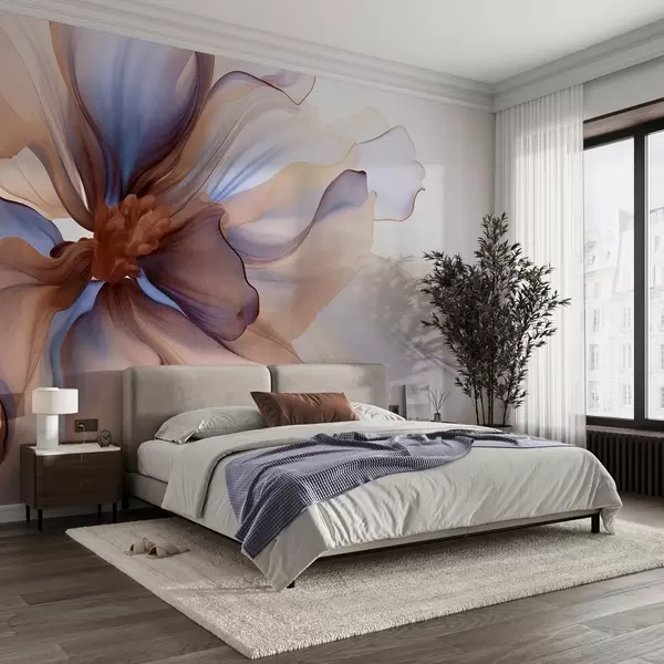 Murais de parede Flor detalhada com textura grande, com pétalas brancas, azuis e castanhas, sobre fundo branco Nr. w09498