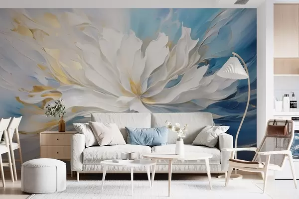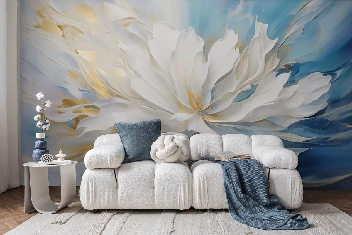 Murais de parede Grande peónia branca em estilo pintura a óleo sobre fundo azul-amarelo Nr. w09511