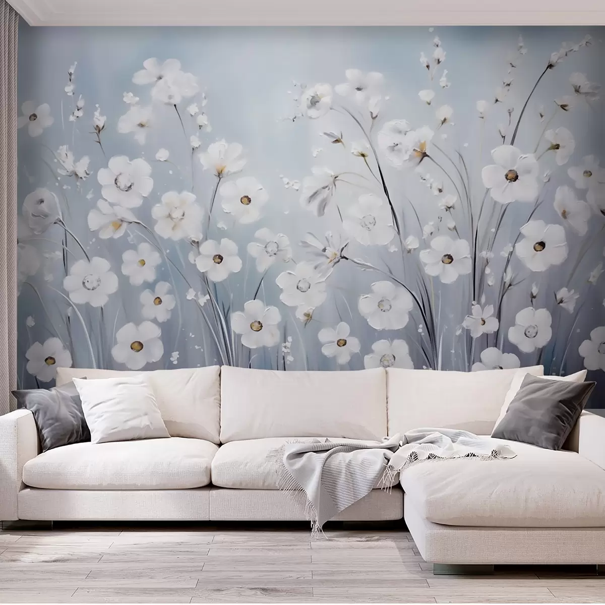 Murais de parede Flores brancas contra um céu azul em estilo pintura a óleo Nr. w09516