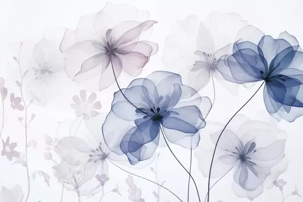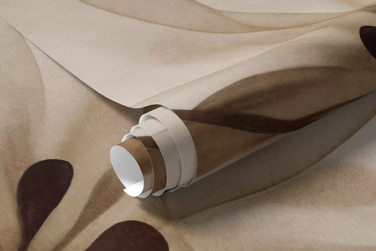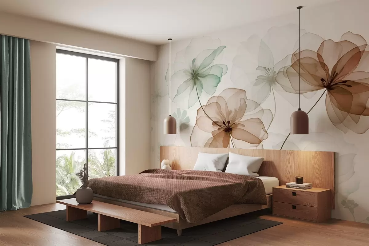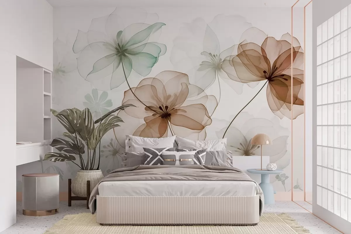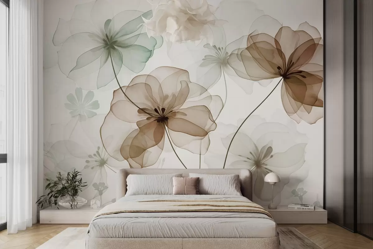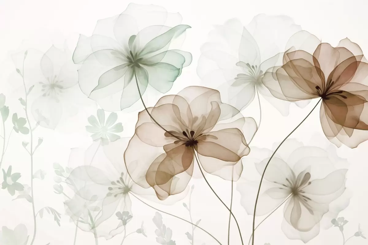 Murais de parede Flores translúcidas com pétalas castanhas e verdes, hastes longas, fundo claro, cores suaves, desenho floral texturizado Nr. w09529