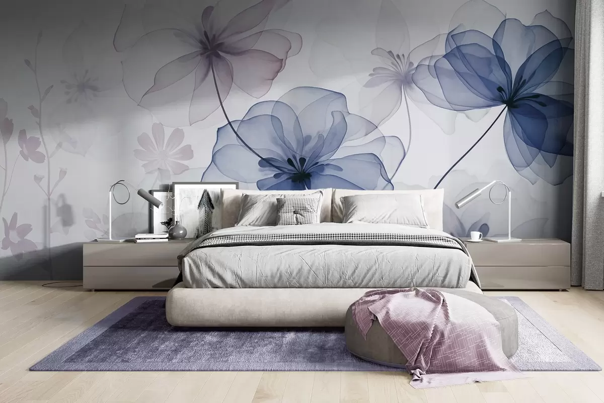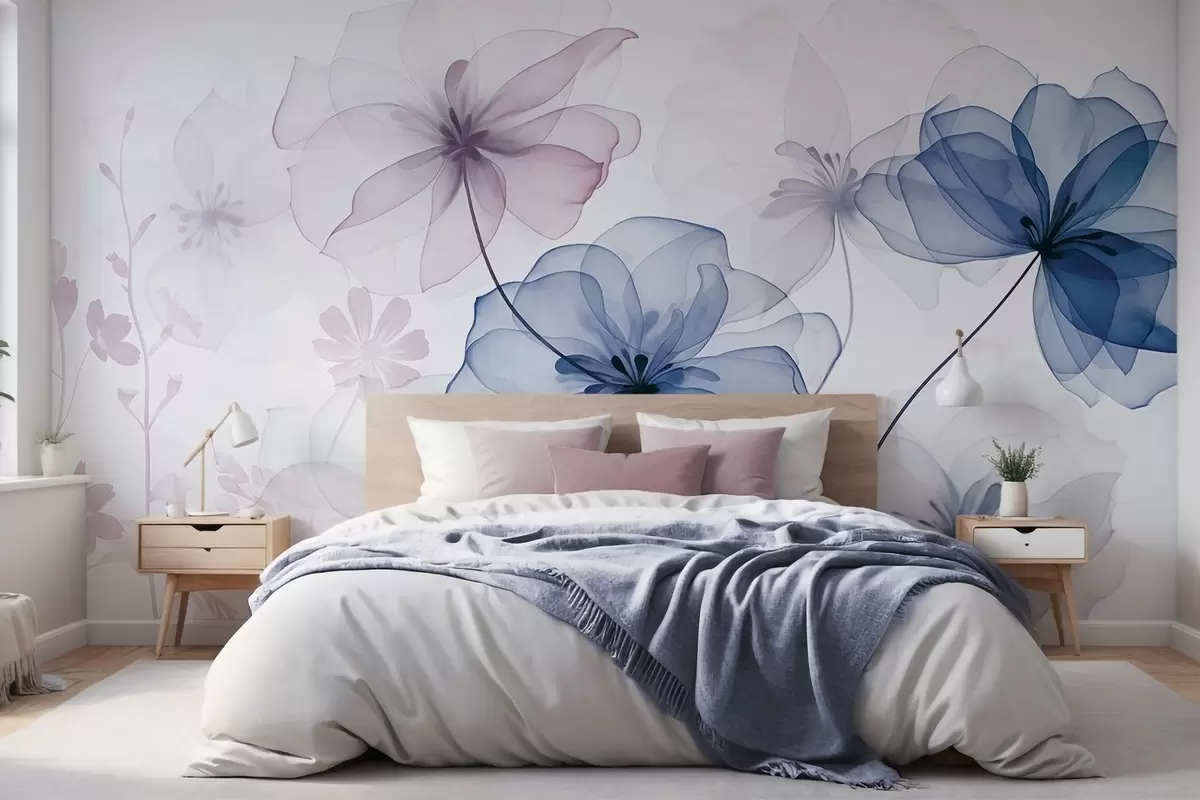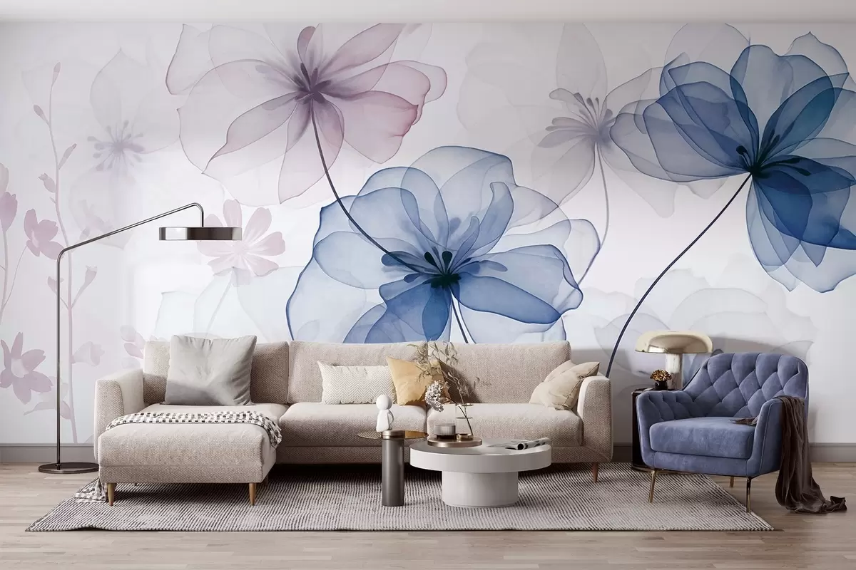 Murais de parede Flores translúcidas com pétalas em tons suaves de azul e rosa, hastes longas, fundo claro, cores suaves, desenho floral texturizado Nr. w09529v1