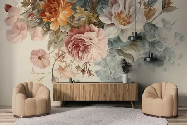 Murais de parede Arranjo floral vintage com rosas, peônias e outras flores texturizadas com folhagem, sobre um fundo claro Nr. w09532