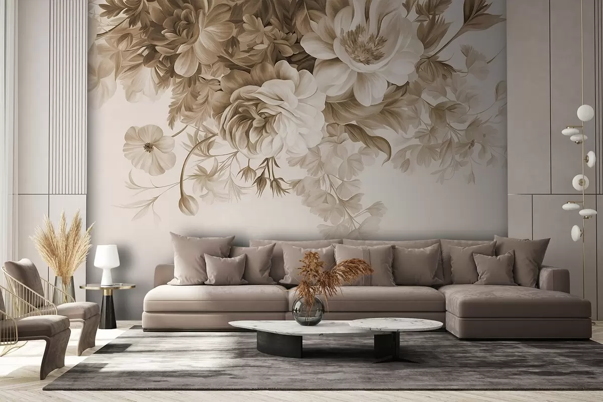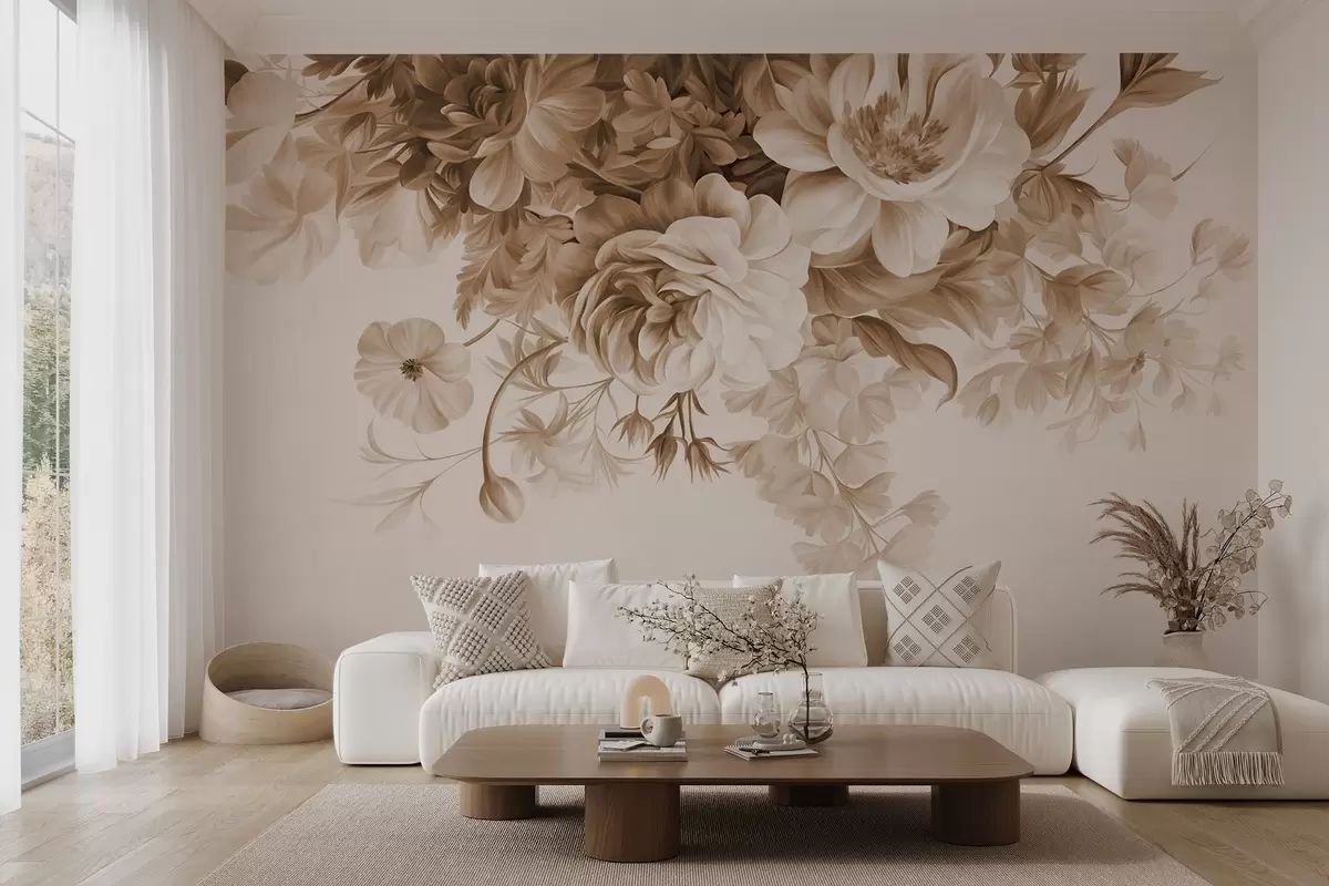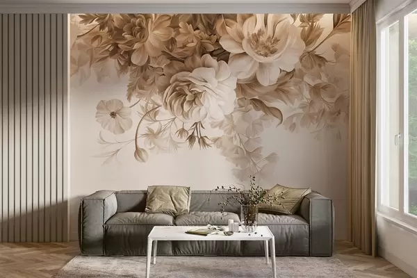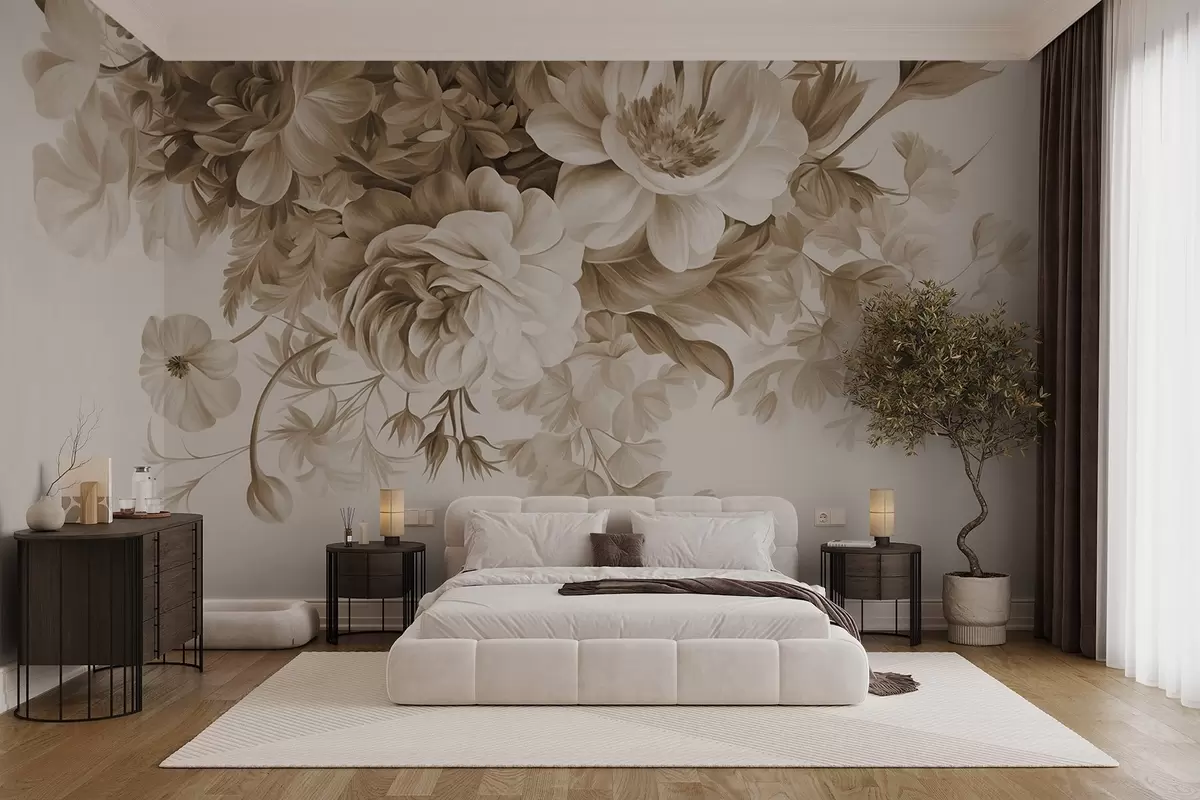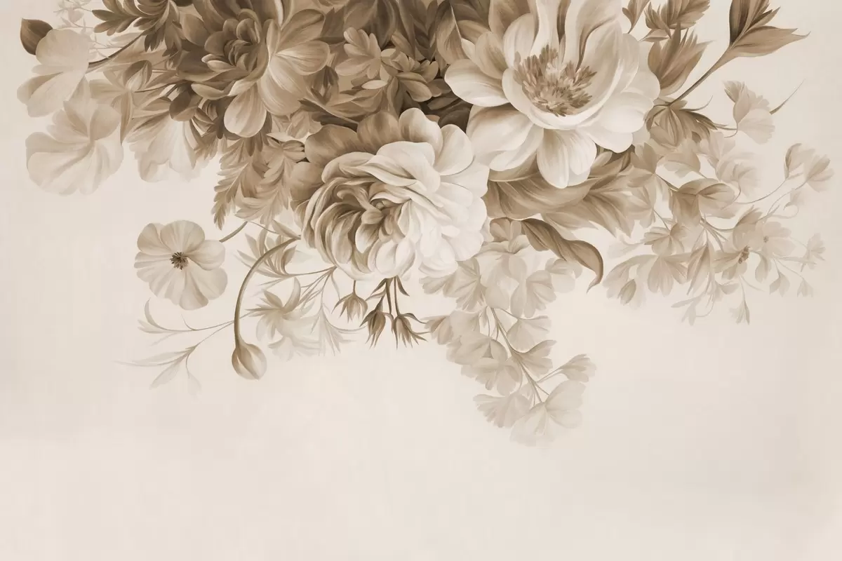 Murais de parede Arranjo floral vintage com rosas, peônias e outras flores texturizadas com folhagem, sobre um fundo claro Nr. w09532v1