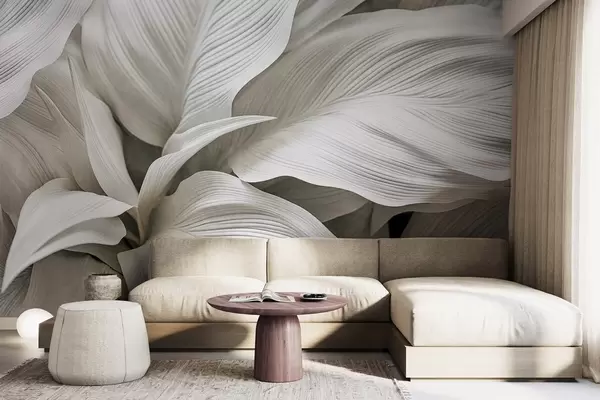 Murais de parede Folhas brancas grandes e texturizadas com veias proeminentes, sobrepostas e criando profundidade Nr. w09536