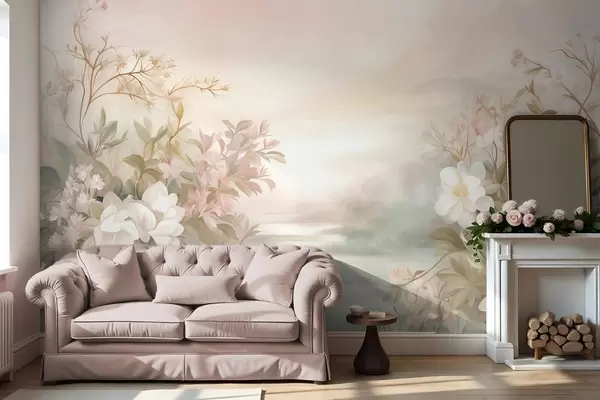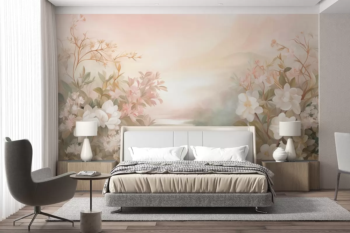 Murais de parede Uma paisagem com um rio rodeado por flores e plantas, cores suaves, céu rosa, estilo texturizado em aquarela Nr. w09537