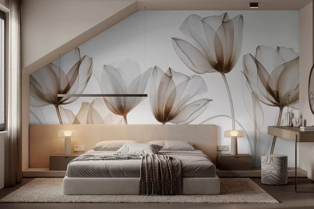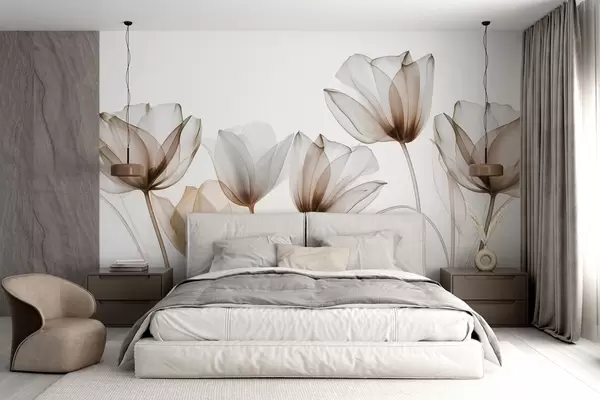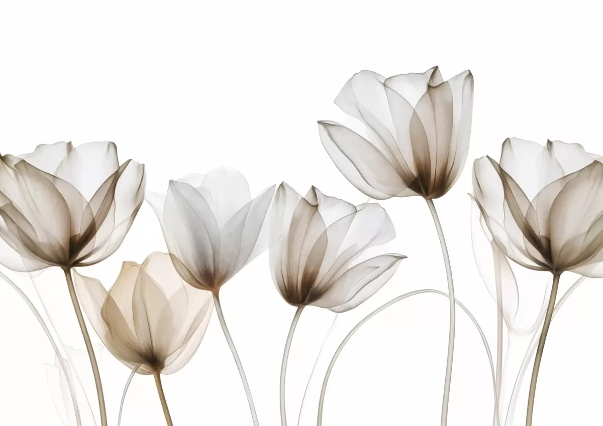 Murais de parede Flores de tulipa translúcidas castanhas e brancas com hastes longas, contra um fundo claro, arte floral delicada e texturizada Nr. w09538v1