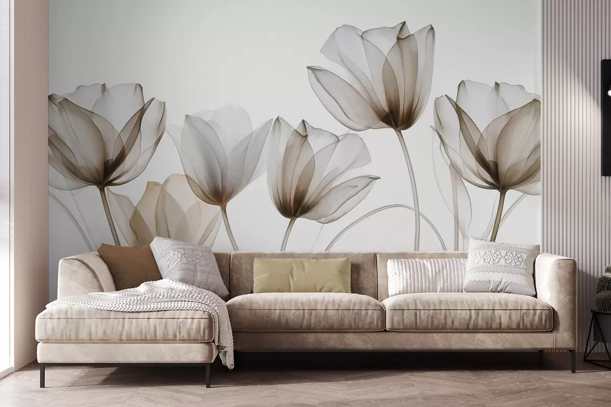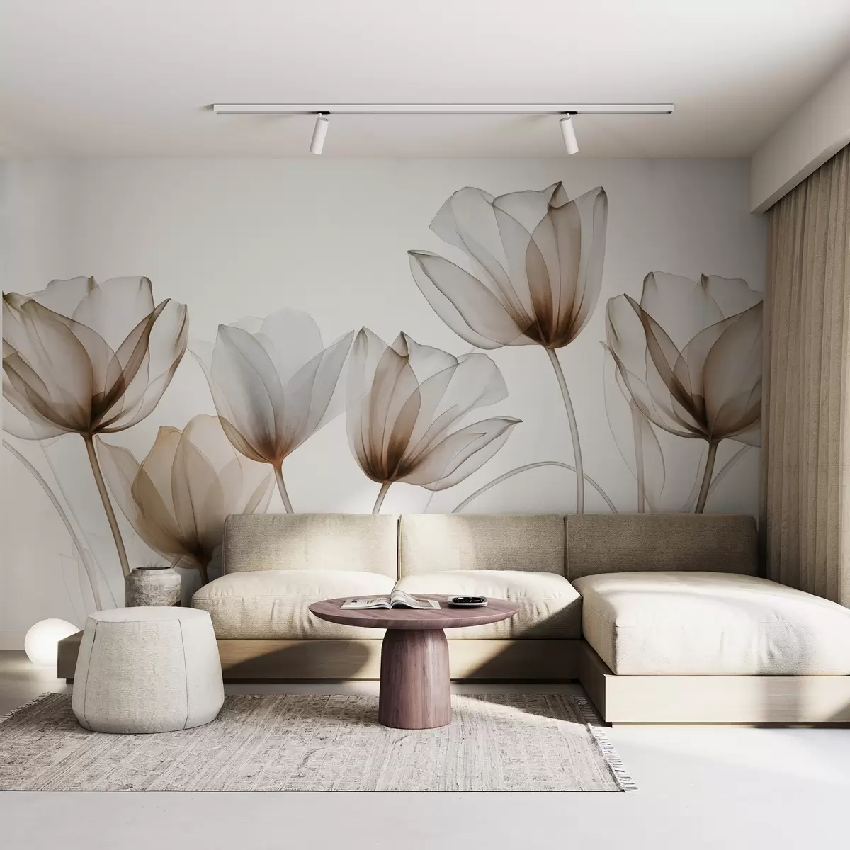 Murais de parede Flores de tulipa translúcidas castanhas e brancas com hastes longas, contra um fundo claro, arte floral delicada e texturizada Nr. w09538v1