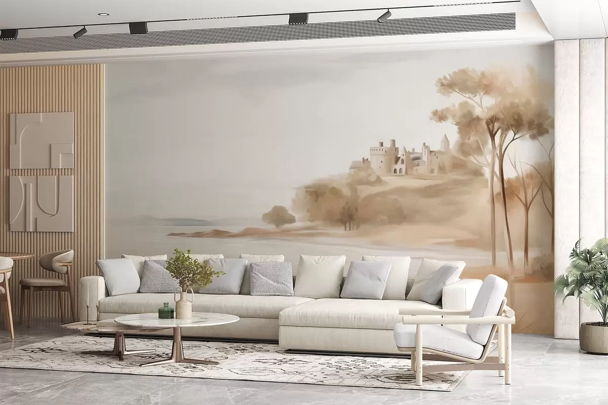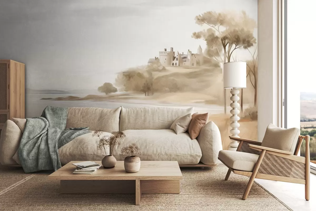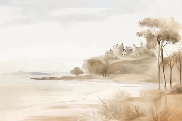 Murais de parede Paisagem com um castelo numa colina perto do mar, uma praia arenosa em primeiro plano, cores suaves, arte texturizada Nr. w09540