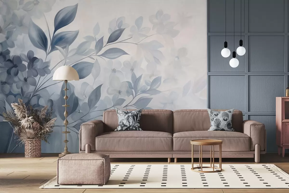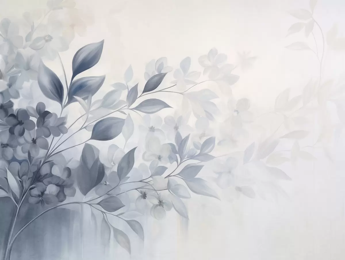 Murais de parede Ramo azul e branco texturizado com flores e folhas esbatidas num fundo claro, ao estilo de pintura em aguarela Nr. w09543