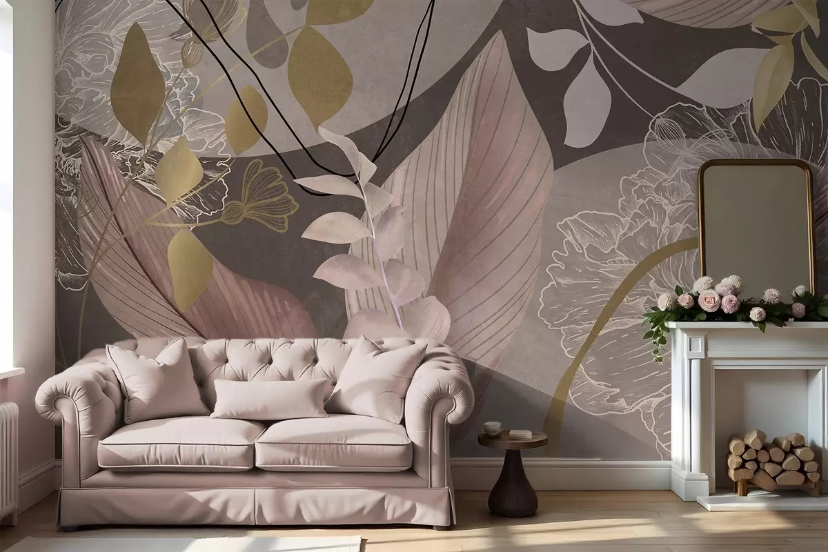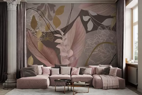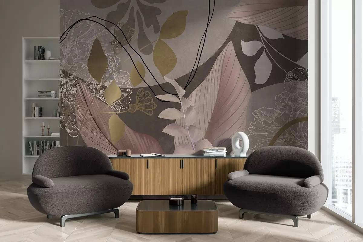 Murais de parede Estampado floral abstrato com folhas grandes em tons suaves de rosa e castanho, com finas linhas pretas e contornos florais brancos. Nr. w09544