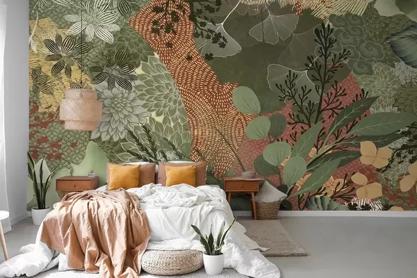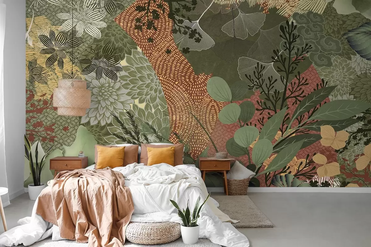 Murais de parede Colagem abstrata texturizada de elementos botânicos com folhas, flores e texturas orgânicas, em tons de verde e castanho. Nr. w09545