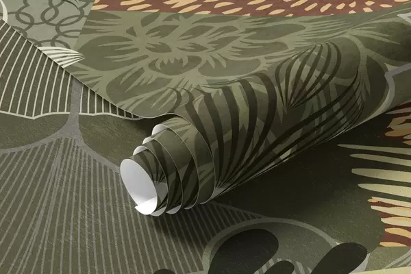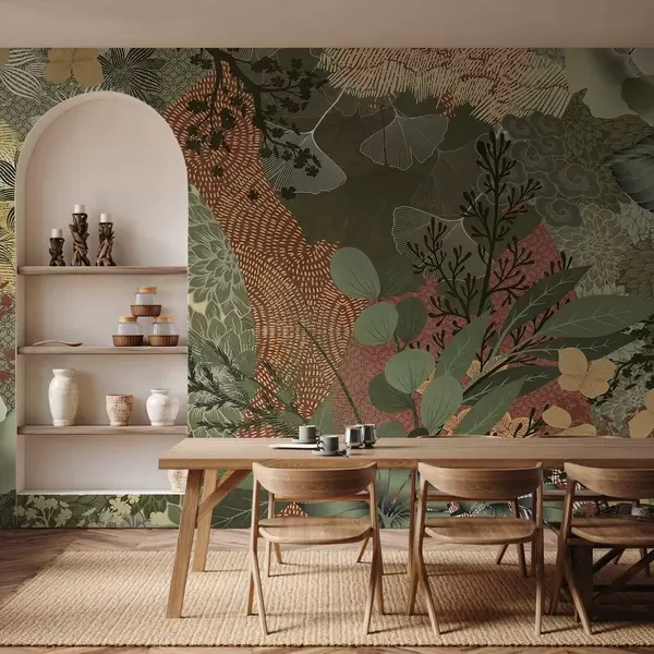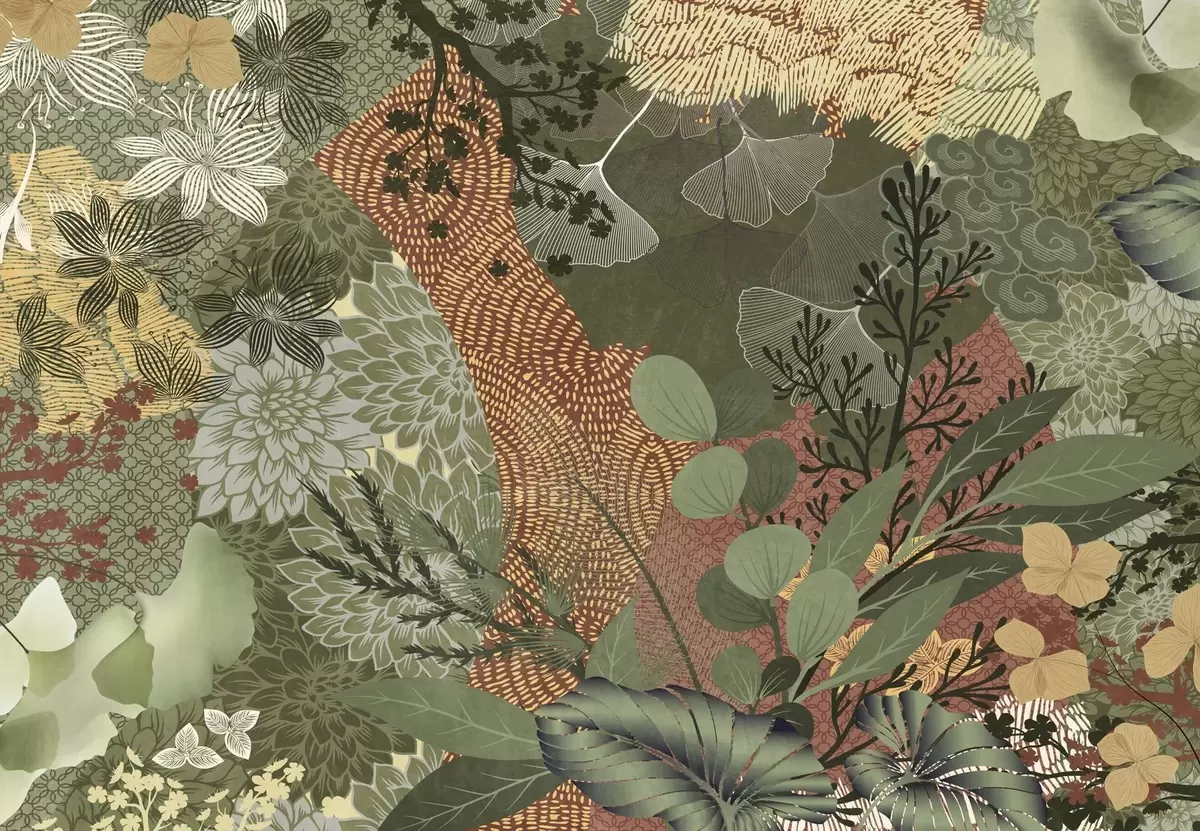 Murais de parede Colagem abstrata texturizada de elementos botânicos com folhas, flores e texturas orgânicas, em tons de verde e castanho. Nr. w09545
