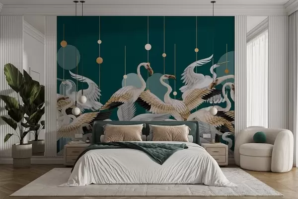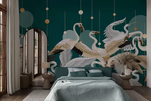 Murais de parede Um bando de flamingos brancos com asas delicadas, contra um fundo azul-petróleo escuro com linhas e círculos amarelos Nr. w09546