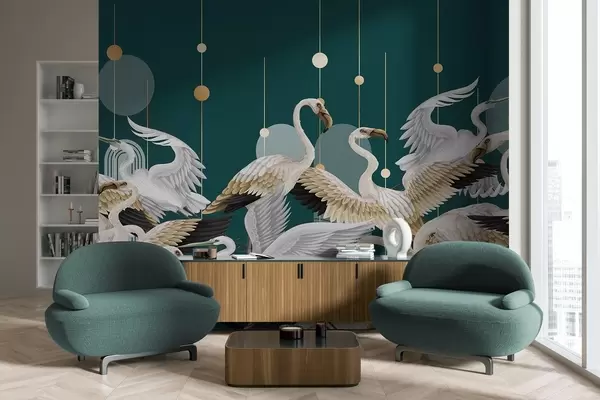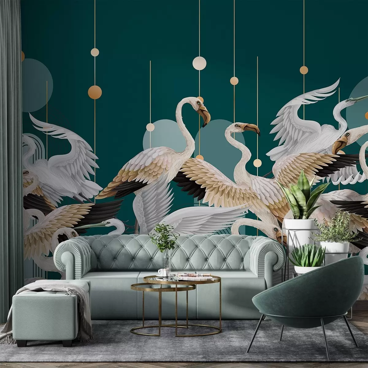 Murais de parede Um bando de flamingos brancos com asas delicadas, contra um fundo azul-petróleo escuro com linhas e círculos amarelos Nr. w09546