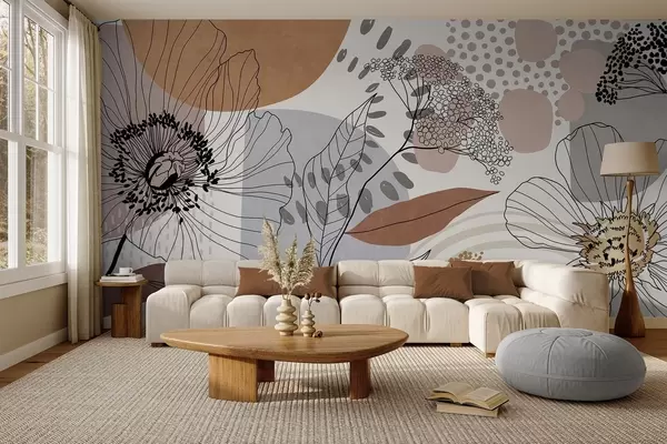 Murais de parede Estampa floral abstrata com flores, folhas e formas orgânicas em tons suaves de castanho, bege e cinza. Nr. w09548