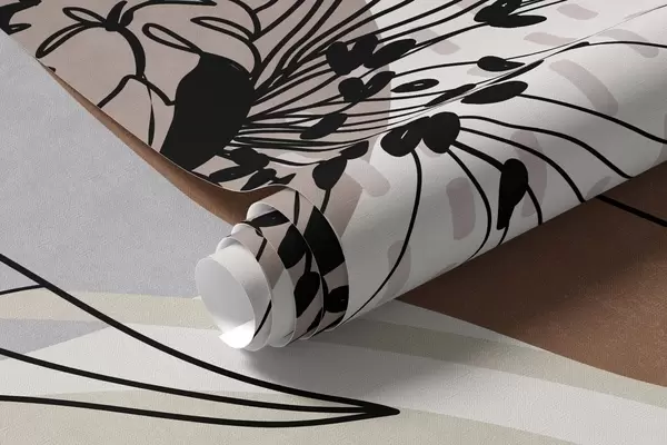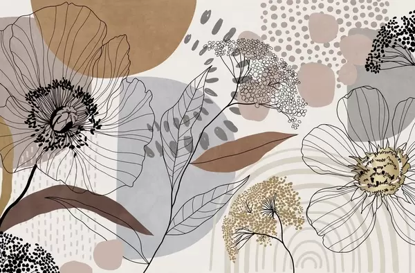 Murais de parede Estampa floral abstrata com flores, folhas e formas orgânicas em tons suaves de castanho, bege e cinza. Nr. w09548