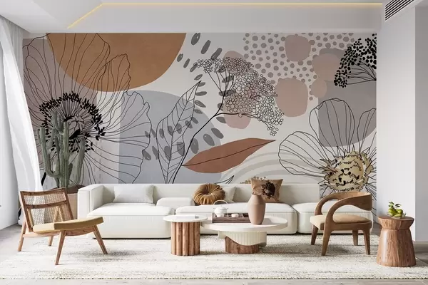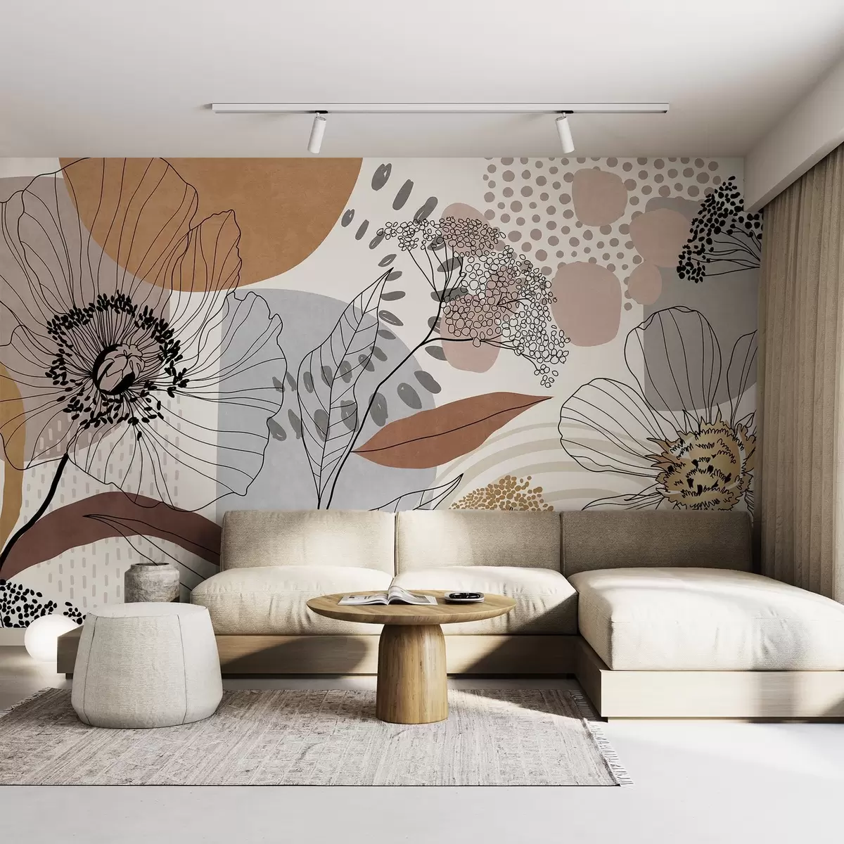 Murais de parede Estampa floral abstrata com flores, folhas e formas orgânicas em tons suaves de castanho, bege e cinza Nr. w09548