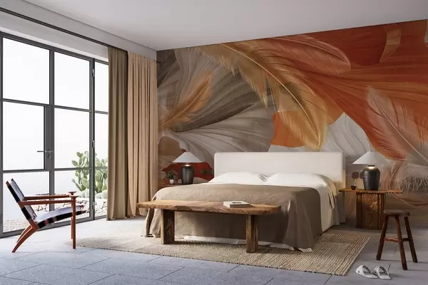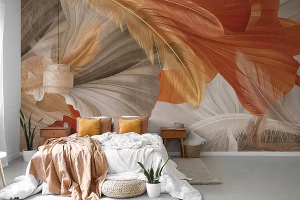 Murais de parede Formas abstratas texturizadas e fluidas em tons creme e ferrugem com delicadas penas amarelas, bege e castanhas Nr. w09549
