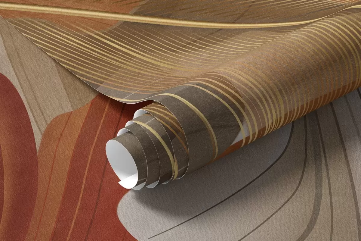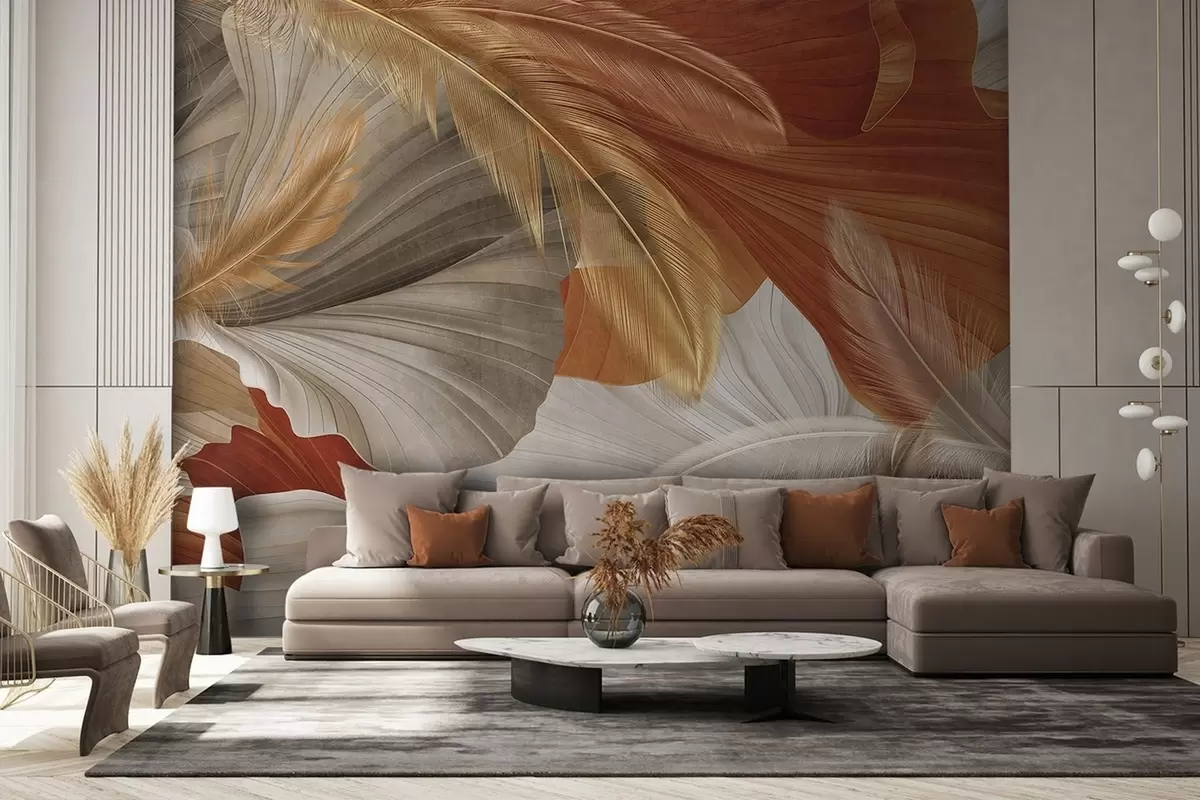 Murais de parede Formas abstratas texturizadas e fluidas em tons creme e ferrugem com delicadas penas amarelas, bege e castanhas Nr. w09549