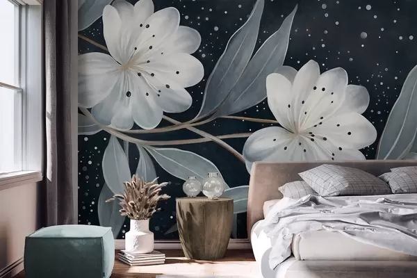 Murais de parede Flores brancas com textura fantasiosa, rodeadas por folhas e ramos azul-esverdeados contra um fundo escuro Nr. w09551