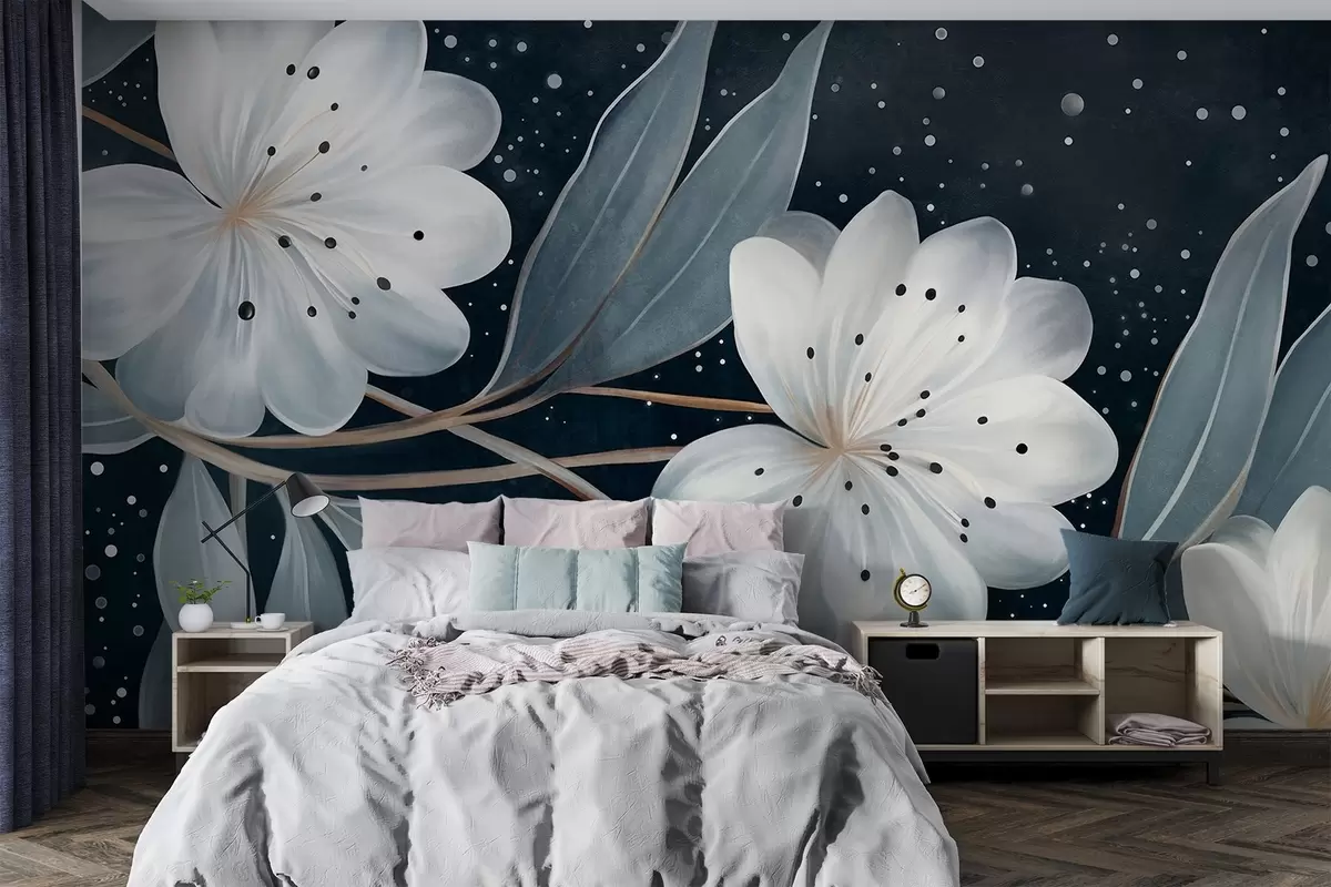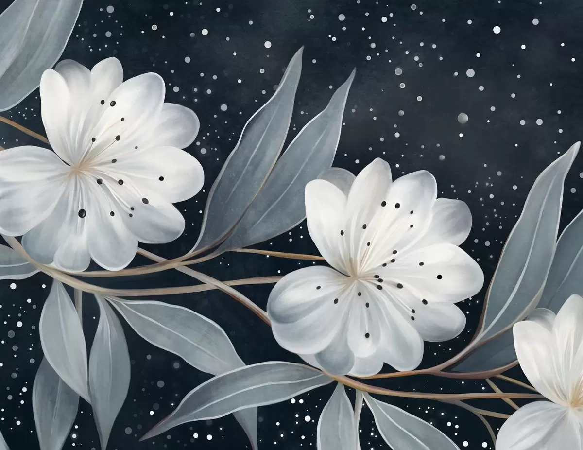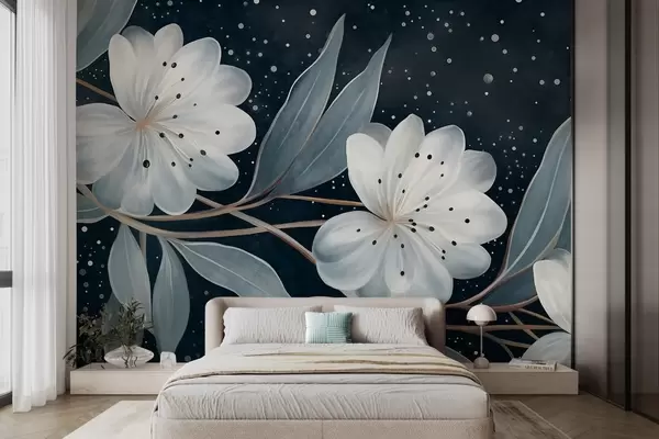 Murais de parede Flores brancas com textura fantasiosa, rodeadas por folhas e ramos azul-esverdeados contra um fundo escuro Nr. w09551