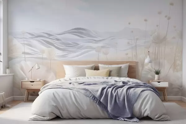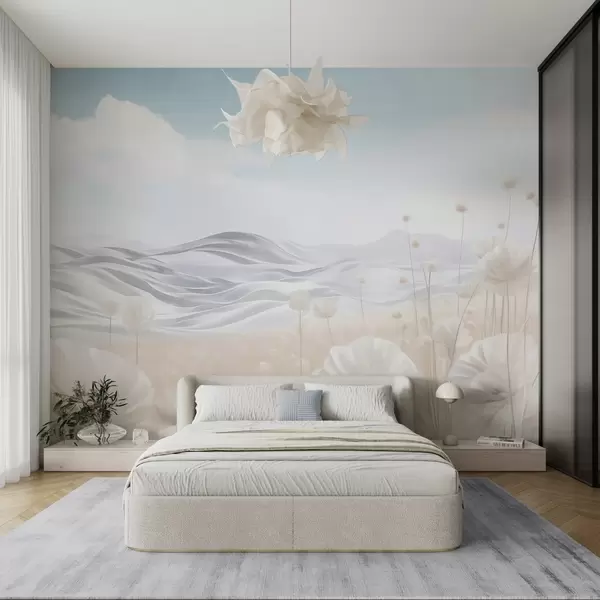 Murais de parede Campo texturizado de papoilas cremosas com colinas ondulantes sob um céu azul claro com nuvens suaves, cores pastel Nr. w09553