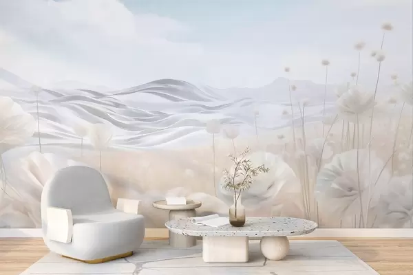 Murais de parede Campo texturizado de papoilas cremosas com colinas ondulantes sob um céu azul claro com nuvens suaves, cores pastel Nr. w09553
