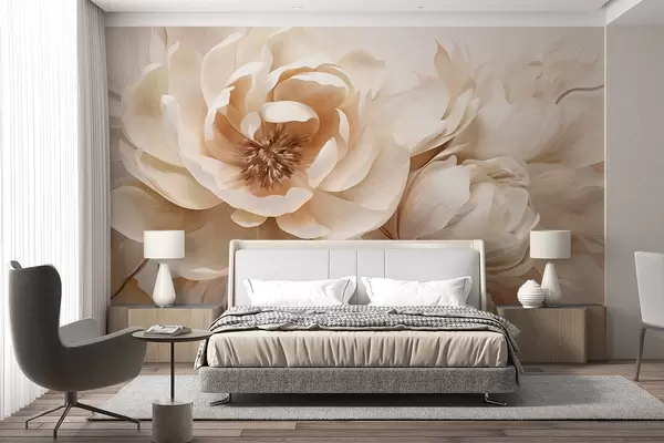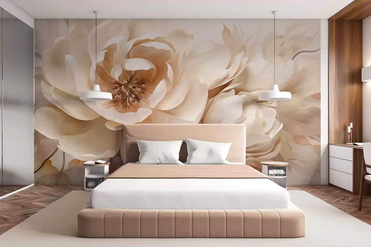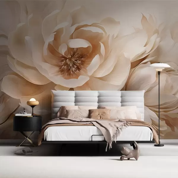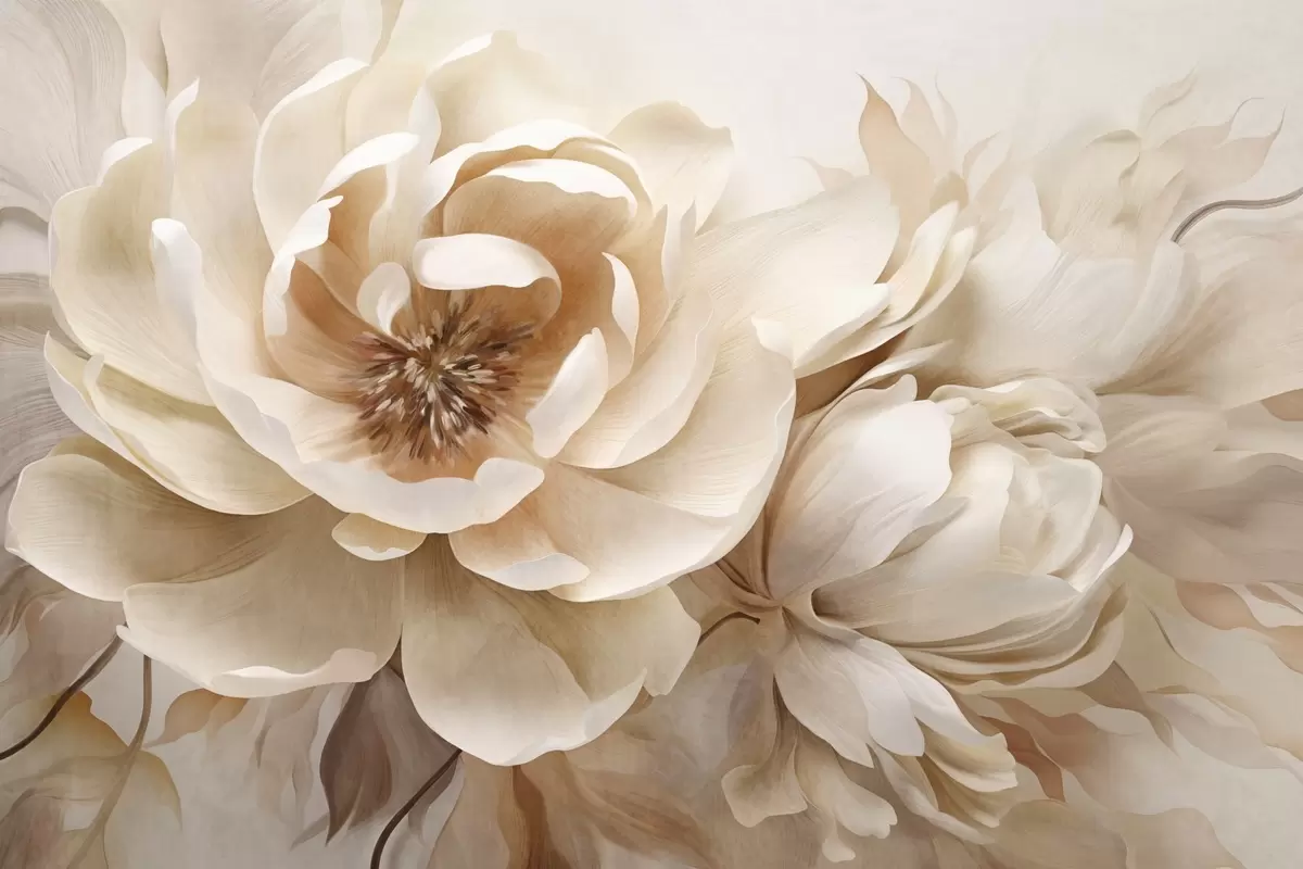 Murais de parede Peônias com textura cremosa, centros castanhos e folhas sobre um fundo abstrato claro e desfocado Nr. w09554