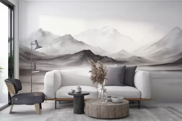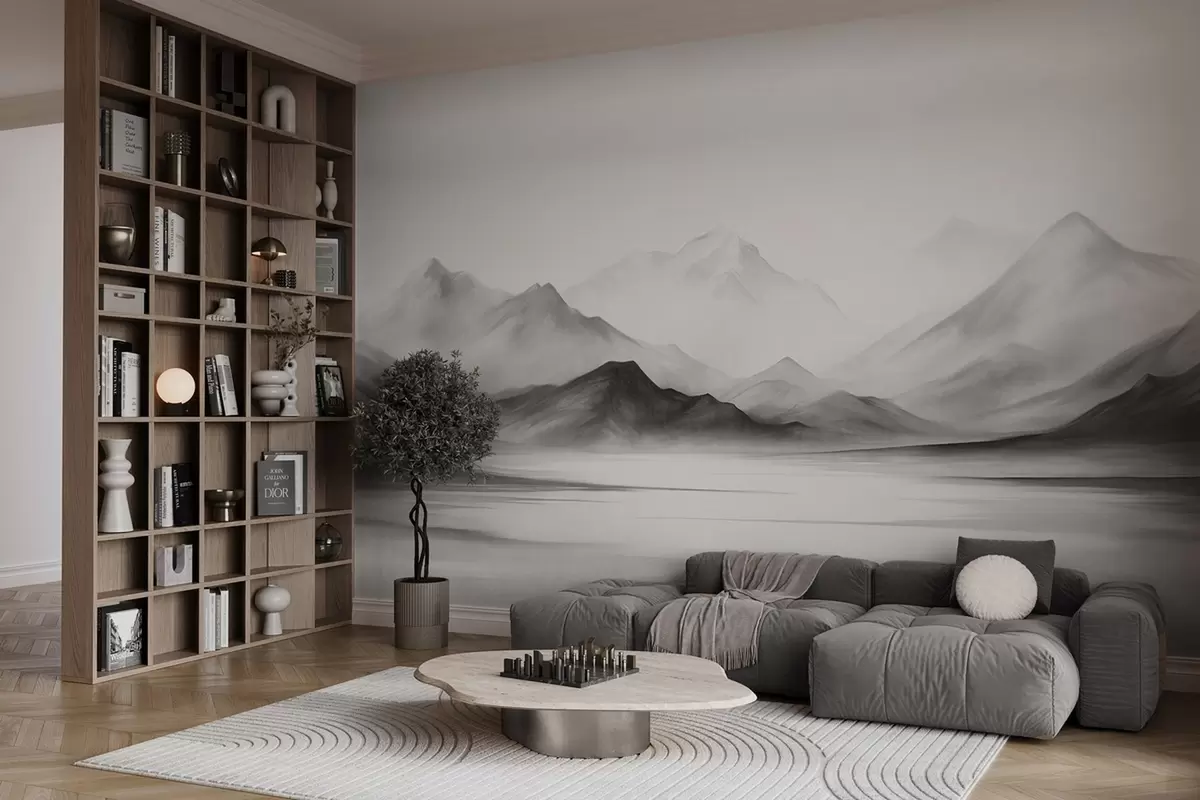 Murais de parede Uma paisagem monocromática texturizada com montanhas enevoadas e um lago em primeiro plano Nr. w09555