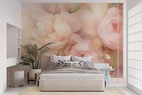 Murais de parede Peônias em tons suaves de rosa pálido e creme com pinceladas suaves e pictóricas, criando um arranjo floral texturizado. Nr. w09556