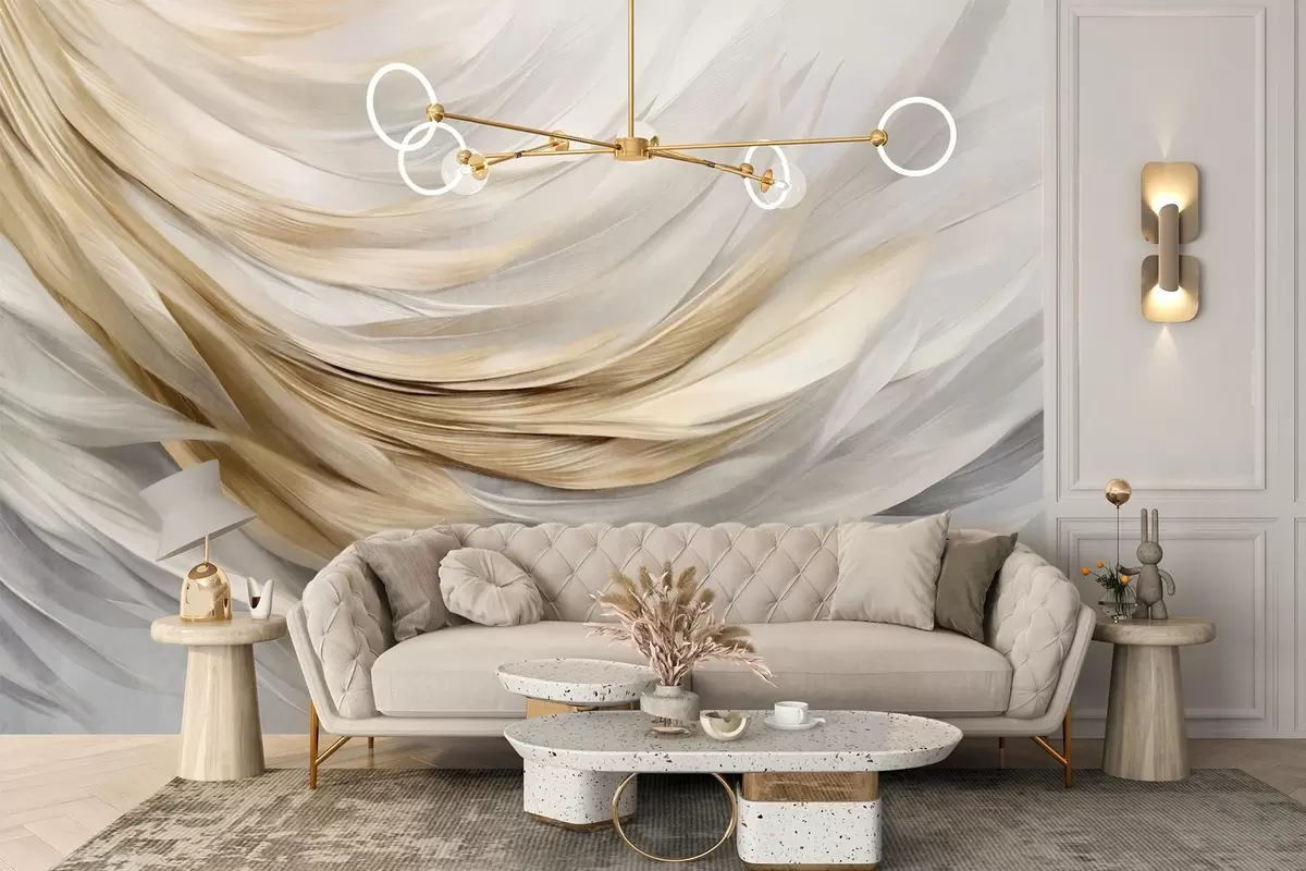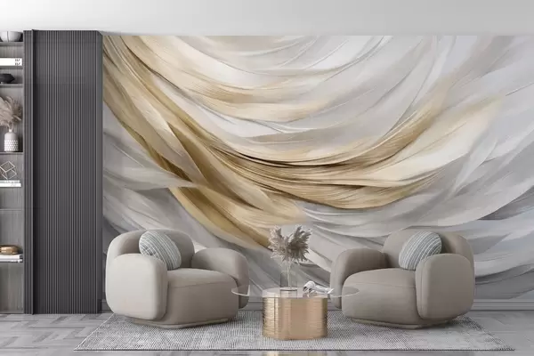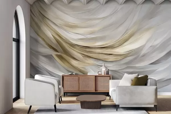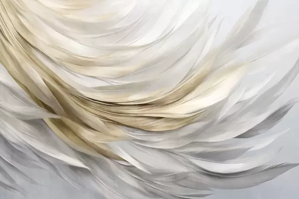 Murais de parede Penas abstratas com textura branca, cinzenta e amarela, criando um padrão fluido e em camadas contra um fundo claro Nr. w09557