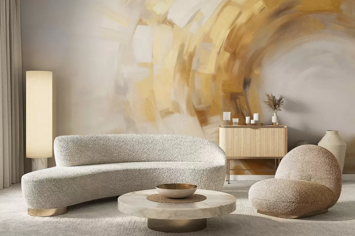 Murais de parede Imitação de pintura abstrata com pinceladas circulares texturizadas em amarelo e branco, criando uma sensação de movimento Nr. w09558