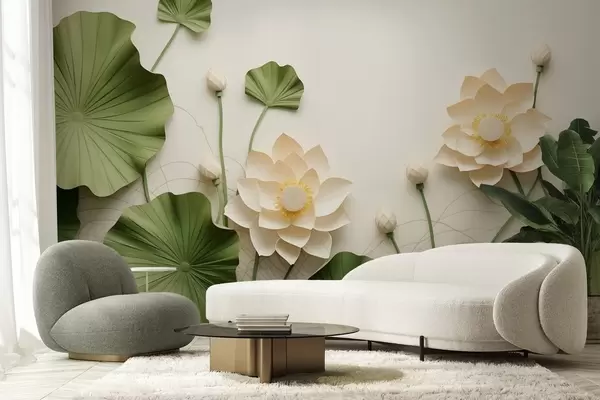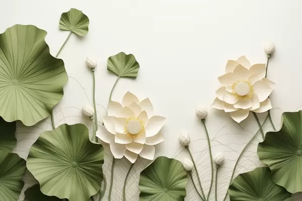 Murais de parede Flores de lótus em 3D com folhas verdes texturizadas, estilo minimalista Nr. w09560